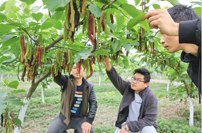 近日,在四川省眉山市岷江現(xiàn)代農業(yè)示范園區(qū)的熱帶水果種植基地,從臺灣引進種植的“果桑之王”——四季長果桑目前成功掛果。這種臺灣超長果??蓪崿F(xiàn)四季均可掛果,其果長12至18厘米,最大單果達20克。圖為農業(yè)技術人員帶客戶查看即將進入采摘期的臺灣四季長果桑葚。姚永亮攝