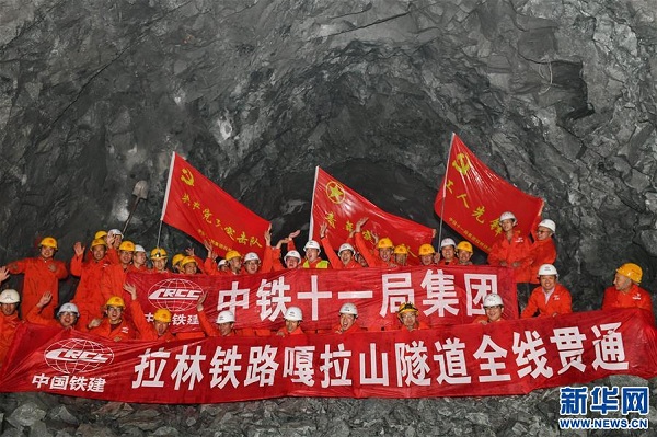 4月7日,中鐵十一局施工人員慶祝嘎拉山隧道工程貫通。新華社記者 張汝鋒 攝
