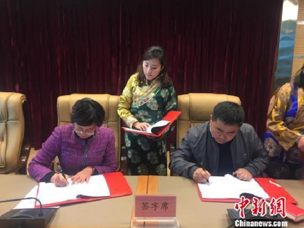 西藏自治區(qū)商務(wù)廳副廳長(zhǎng)周慧與順豐集團(tuán)西藏片區(qū)總經(jīng)理賈永建簽署協(xié)議。 趙朗 攝