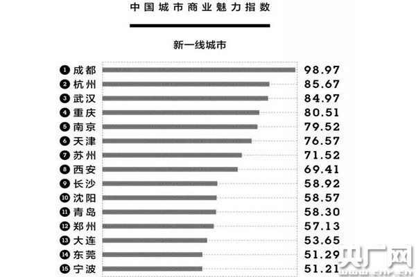 根據(jù)綜合計算,北上廣深4個一線城市的地位依然不可動搖,但15個“新一線”城市的席次有了一些改變,依次是成都、杭州、武漢、重慶、南京、天津、蘇州、西安、長沙、沈陽、青島、鄭州、大連、東莞和寧波。這就意味著,成都領跑新一線城市,居于首位。