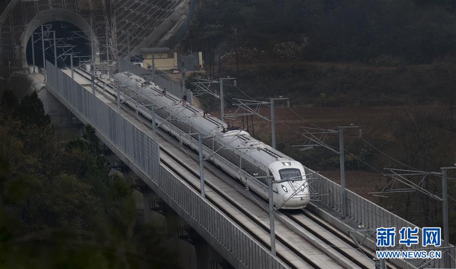 參加西成高鐵模擬運(yùn)行的CRH3A型動(dòng)車組列車通過秦嶺南麓的洋縣龍亭鎮(zhèn)趙家?guī)X隧道(11月22日攝)。新華社記者 吳曉初 攝