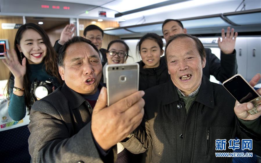 11月25日,張騫后裔在西成高鐵55854試驗(yàn)動(dòng)車的車廂里與家人視頻連線。新華社記者 陶明 攝