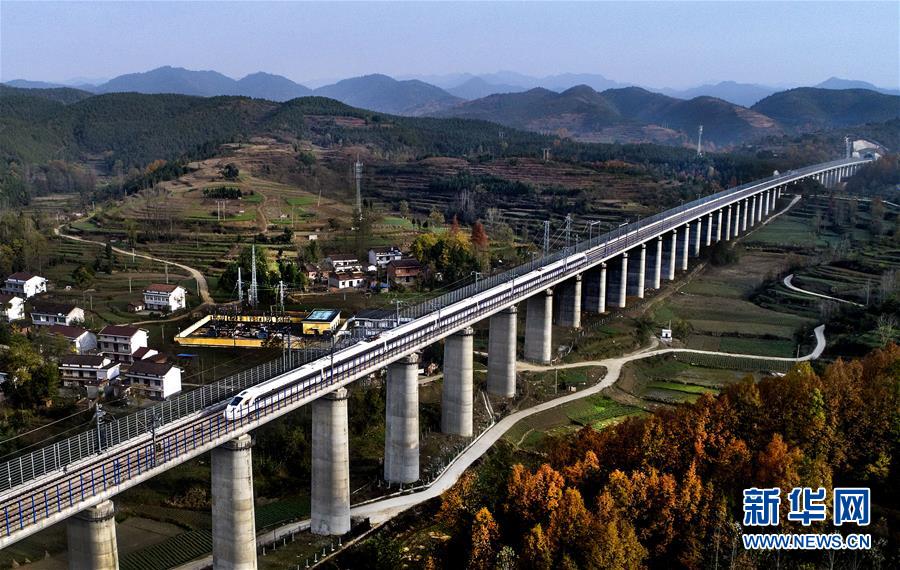 參加模擬運(yùn)行的55251次CRH3A型動(dòng)車組列車通過秦嶺任家山高架橋(11月22日攝)。新華社記者 陶明 攝