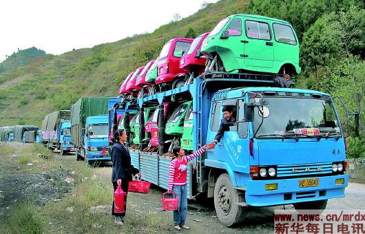 秦蜀交界的陜西省寧強(qiáng)縣棋盤關(guān)因道路難行,108國(guó)道上的車輛常常長(zhǎng)時(shí)間被堵塞途中(2002年10月23日攝)。10年前,西安至成都高速公路的全線通車,108國(guó)道上已不再堵塞。新華社記者 陶明 攝