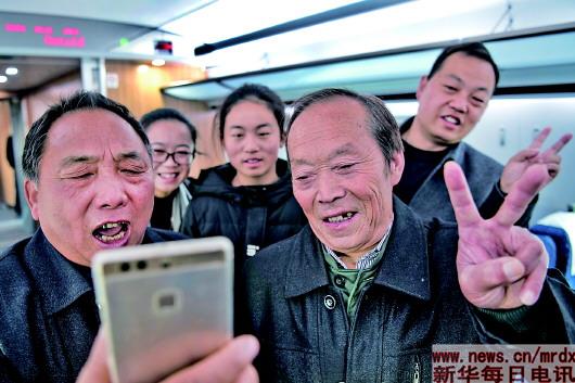 張騫第65代后裔張華忠(左一)、第67代后裔(右二)張永福等在西成高鐵55854試驗(yàn)動(dòng)車的車廂里與家人視頻連線。他們是張騫第65—68代傳人(11月25日攝)。11月25日,西安鐵路局漢中車站邀請(qǐng)張騫后裔體驗(yàn)即將正式開通的西安至成都動(dòng)車組列車。張騫是漢中市城固人,古代絲綢之路的開拓者。 新華社記者 陶明 攝