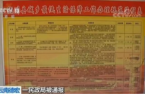 昨天(21日),記者在隴川縣民政局看到,大廳懸掛了“隴川縣城鄉(xiāng)最低生活保障工作辦理規(guī)范流程表”,對低保的辦理流程、具體要求等方面進(jìn)行了公示。工作人員介紹說,流程表是紀(jì)委對民政局案件展開調(diào)查后不久懸掛的。