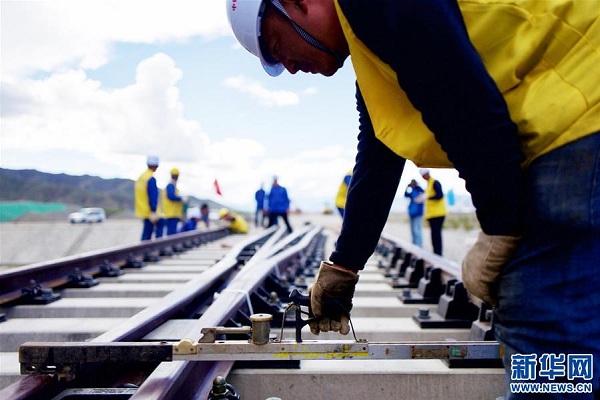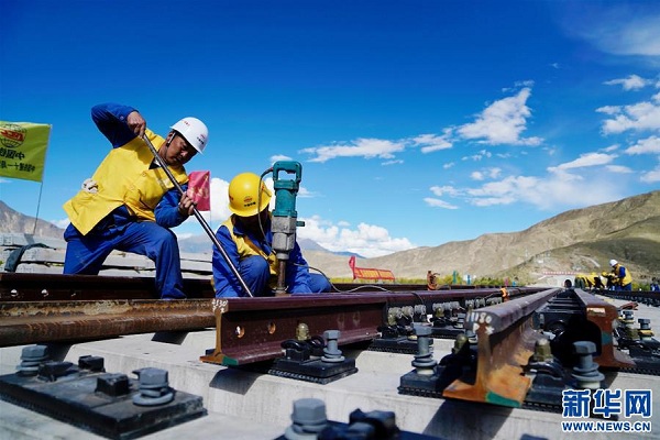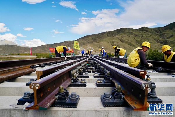 9月16日,中鐵十一局三公司施工人員在川藏鐵路拉林段鋪設首組道岔。新華社記者 普布扎西 攝
