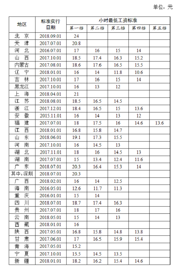 全國各地區(qū)小時最低工資標準情況(截至2018年9月),來源人社部官網(wǎng)