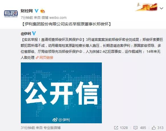 10月24日,伊利集團在自己官網(wǎng)和官方微博上發(fā)布舉報文章,實名舉報前董事長鄭俊懷。