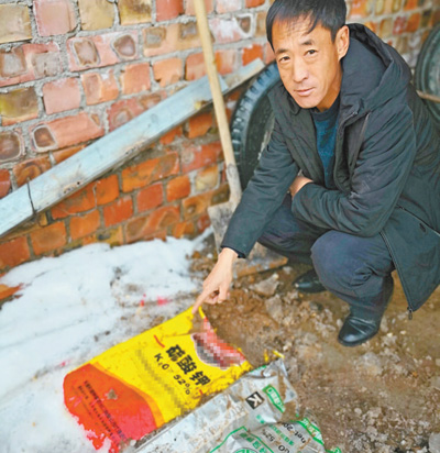種植戶(hù)賈富良家里剩下的假冒偽劣“硫酸鉀化肥”。本報(bào)記者 張 璁?dāng)z