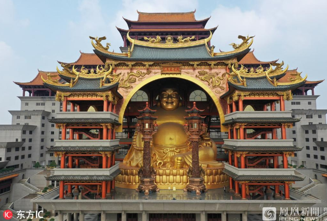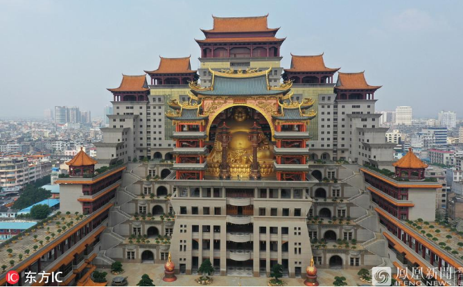 該建筑占地70畝,主體建筑為一座21層、高達108米的高樓,供奉有一座高30米,重約600噸的全世界最大室內佛像。