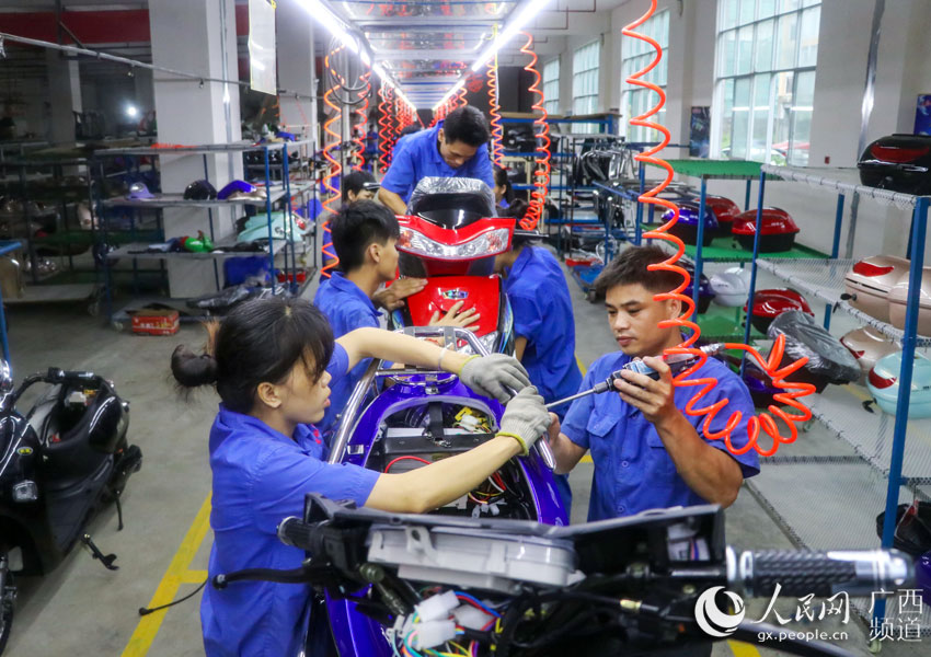 貴港市中國(guó)東盟電動(dòng)車生產(chǎn)基地,工人正在生產(chǎn)電動(dòng)車。(郭曉楓 攝)