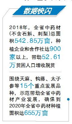 貴州是全國(guó)中藥材四大主產(chǎn)區(qū)之一,發(fā)展中藥材產(chǎn)業(yè)具有得天獨(dú)厚的資源優(yōu)勢(shì)。經(jīng)過(guò)不懈努力,中藥材規(guī)模不斷提高,大方天麻、劍河鉤藤、興仁薏仁米、赫章半夏、施秉太子參等一批區(qū)域公共品牌基本形成,培育了信邦、百靈、益佰等49家省級(jí)以上龍頭企業(yè)。2018年,全省中藥材(不含石斛、刺梨)總面積542.85萬(wàn)畝、總產(chǎn)值108.83億元,種植企業(yè)和合作社達(dá)900家以上,帶動(dòng)16.42萬(wàn)戶貧困戶、52.61萬(wàn)貧困人口增收脫貧。