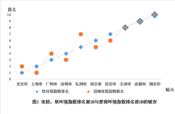 根據(jù)《營(yíng)商環(huán)境報(bào)告》的評(píng)價(jià)結(jié)果,在中國經(jīng)濟(jì)規(guī)模排名前100的城市中,營(yíng)商環(huán)境指數(shù)排名前十的城市為上海、北京、深圳、廣州、南京、武漢、杭州、天津、成都、西安;軟環(huán)境指數(shù)排名前十的分別為北京、上海、廣州、深圳、杭州、南京、武漢、天津、成都、西安。此評(píng)價(jià)結(jié)果顯示,軟環(huán)境指數(shù)排名前十的城市與營(yíng)商環(huán)境指數(shù)排名前十的城市高度一致,軟環(huán)境成為決定城市營(yíng)商環(huán)境競(jìng)爭(zhēng)力的關(guān)鍵因素。