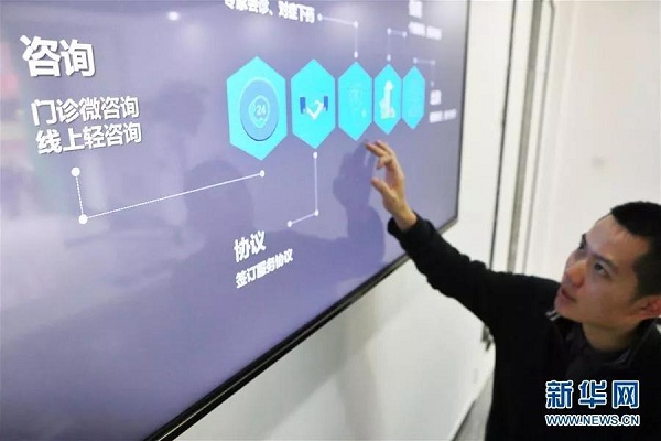 5月20日,在貴州省貴安新區(qū)大學(xué)城雙創(chuàng)園內(nèi)的“雙創(chuàng)醫(yī)院”,工作人員在展示“雙創(chuàng)醫(yī)院”的服務(wù)模式。 新華社記者 歐東衢 攝