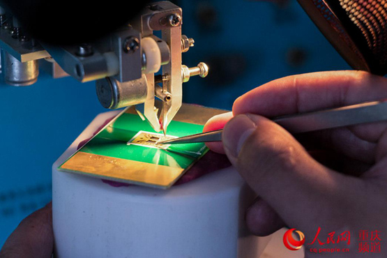重慶線易科技的科研人員正在為芯片打線。陳居銘攝
