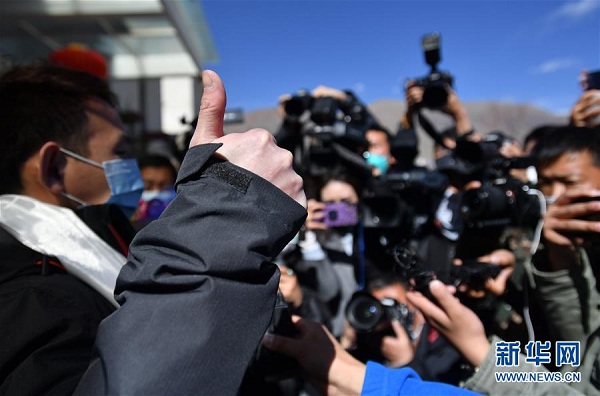 2月12日,在西藏自治區(qū)第三人民醫(yī)院,西藏唯一新冠肺炎患者治愈出院后豎起大拇指感謝醫(yī)護(hù)人員。新華社記者 覺(jué)果 攝