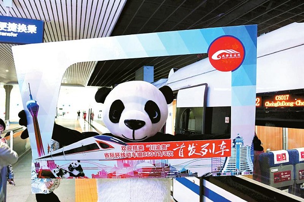 四月十日,熊貓玩偶?xì)g迎川渝貴三省市環(huán)線動(dòng)車首發(fā)列車乘客。記者李向雨攝