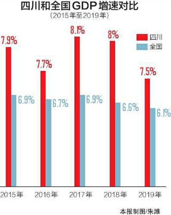 “1、1、1.2、1.4、1.4”。上述5個數(shù)字,分別是2015年至2019年,四川年度GDP增速高于全國GDP增速的百分點數(shù)值。由此可見,過去5年,四川GDP增速一直高于全國1個百分點以上。