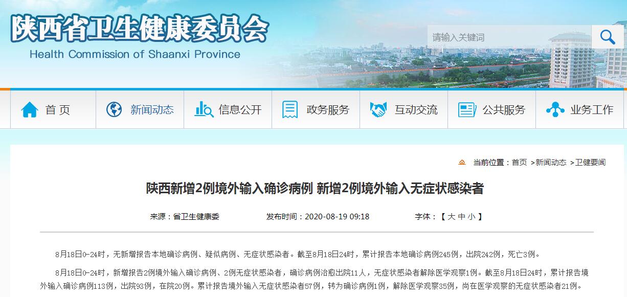 人民網(wǎng)西安8月19日電 據(jù)陜西省衛(wèi)健委消息,8月18日0-24時(shí),無(wú)新增報(bào)告本地確診病例、疑似病例、無(wú)癥狀感染者。截至8月18日24時(shí),累計(jì)報(bào)告本地確診病例245例,出院242例,死亡3例。