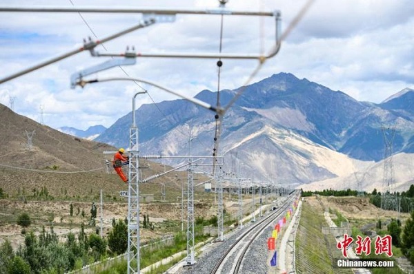 資料圖:川藏鐵路拉薩至林芝段接觸網(wǎng)專業(yè)首件工程在西藏山南市扎囊至扎其區(qū)間成功建成。 中新社記者 何蓬磊 攝