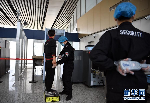 工作人員在??诿捞m國際機場二期擴建項目T2航站樓內(nèi)進行安檢(2020年12月27日攝)。 新華社記者 郭程 攝