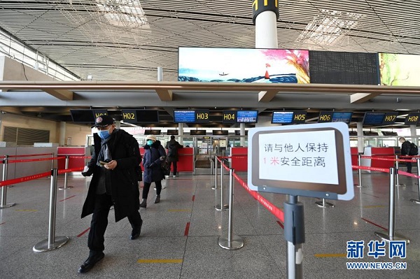 這是1月28日在天津濱海國際機場拍攝的提醒旅客保持間距的提示牌。 新華社記者 李然 攝