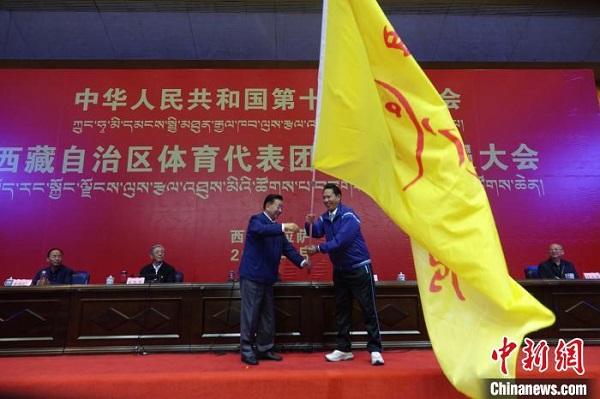 西藏自治區(qū)副主席甲熱·洛桑丹增授代表團(tuán)團(tuán)旗,西藏自治區(qū)體育局局長(zhǎng)尼瑪次仁接旗。 冉文娟 攝