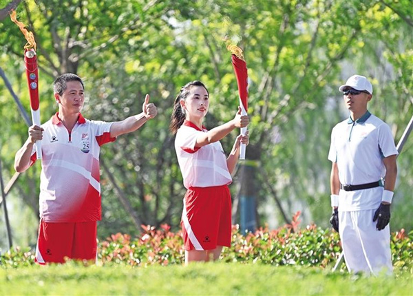 9月12日,火炬手李新春(左)和汪麗麗在火炬?zhèn)鬟f中。新華社記者 劉瀟攝