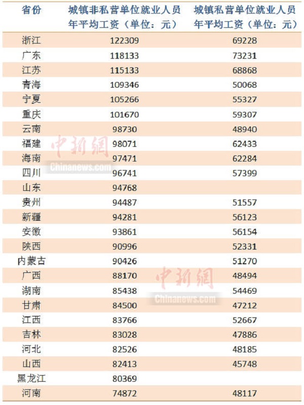 6省份城鎮(zhèn)非私營單位年平均工資超10萬元