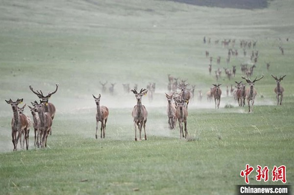 夏日時(shí)節(jié),位于祁連山北麓的甘肅省張掖市肅南裕固族自治縣,數(shù)百頭馬鹿在草原上崩騰、休憩覓食。 楊艷敏 攝