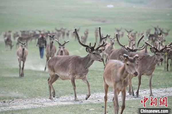 中新網(wǎng)蘭州7月14日電 (楊艷敏)夏日時(shí)節(jié),位于祁連山北麓的甘肅省張掖市肅南裕固族自治縣,數(shù)百頭馬鹿在草原上奔騰、休憩覓食。肅南縣馬鹿養(yǎng)殖場(chǎng)位于祁連山中段海拔2700米至3000米的高山坡谷中。當(dāng)?shù)赝苿?dòng)“工業(yè)+研學(xué)游”,游客可以在欣賞自然風(fēng)光的同時(shí),和馬鹿近距離接觸。