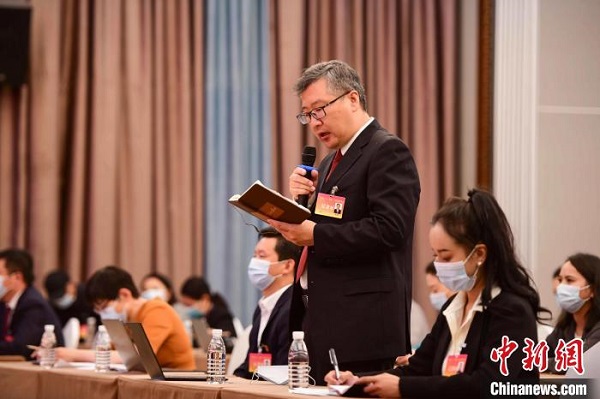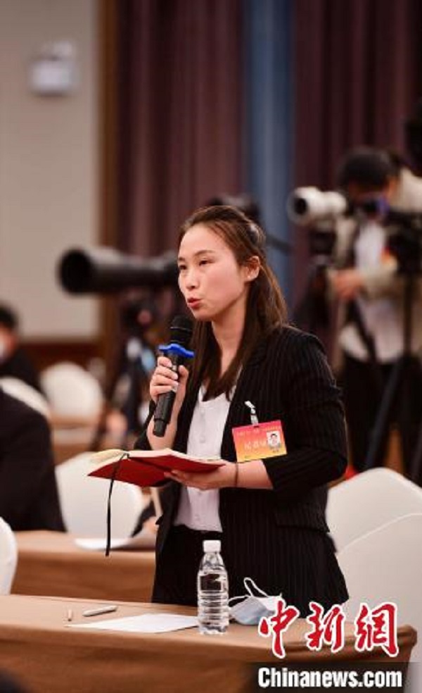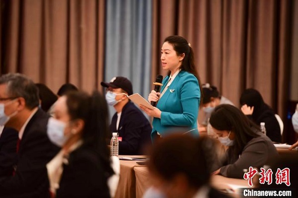 圖為中新社記者提問。貢嘎來松攝