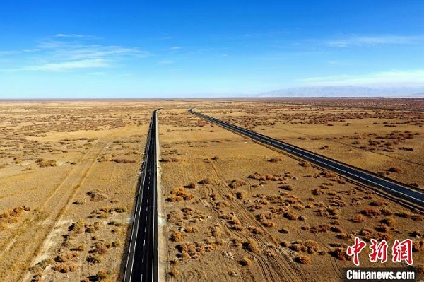 圖為航拍青海格爾木至老茫崖公路擴(kuò)建項(xiàng)目。青海省交控集團(tuán)供圖