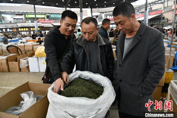 4月上旬,四川省雅安市名山縣,茶商在“世界茶都茶葉交易市場(chǎng)”選購(gòu)茶葉。中新社記者張浪攝