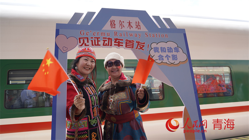 格爾木群眾在復(fù)興號(hào)旁打卡。人民網(wǎng)記者 甘海瓊攝