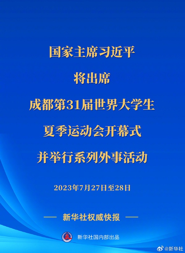 新華社北京7月24日電 外交部發(fā)言人華春瑩24日宣布:國家主席習近平將于7月27日至28日出席成都第31屆世界大學生夏季運動會開幕式,為來華出席開幕式并訪問的外國領導人舉行歡迎宴會和相關雙邊活動。