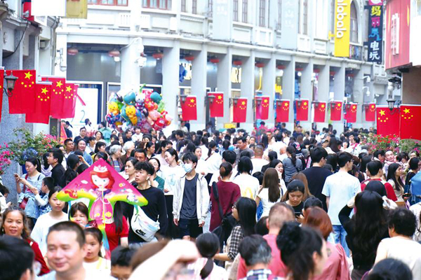 廣西三月三假期,南寧市朝陽商圈步行街游人如織。