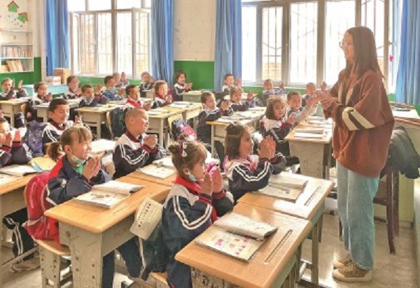 2023年5月,西北師范大學(xué)學(xué)生在新疆阿克蘇地區(qū)溫宿縣吐木秀克鎮(zhèn)第一小學(xué)實(shí)習(xí)支教。卓杰攝