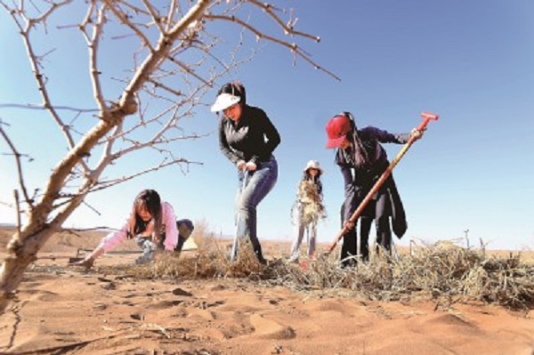 河西學(xué)院學(xué)生在治沙實(shí)踐課中了解防沙治沙過(guò)程。新甘肅·甘肅日?qǐng)?bào)通訊員王將攝