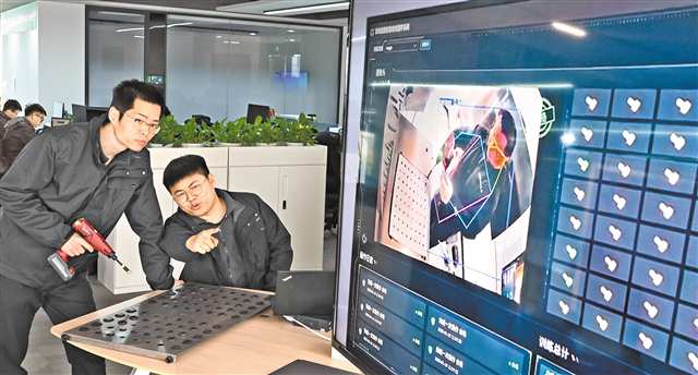 3月11日,位于兩江新區(qū)的廣域銘島數(shù)字科技有限公司,研發(fā)算法小組人員對總裝車間的工人擰緊工藝進(jìn)行動作識別算法分析優(yōu)化。記者 張錦輝 攝/視覺重慶
