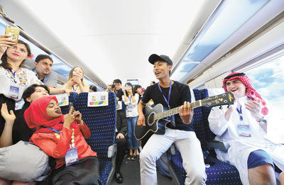 寶蘭高鐵試運(yùn)行已進(jìn)入按圖行車(chē)試驗(yàn)階段,標(biāo)志著進(jìn)入最后的開(kāi)通倒計(jì)時(shí)。圖為中外大學(xué)生在西安開(kāi)往蘭州的試運(yùn)行動(dòng)車(chē)組列車(chē)上聯(lián)歡。