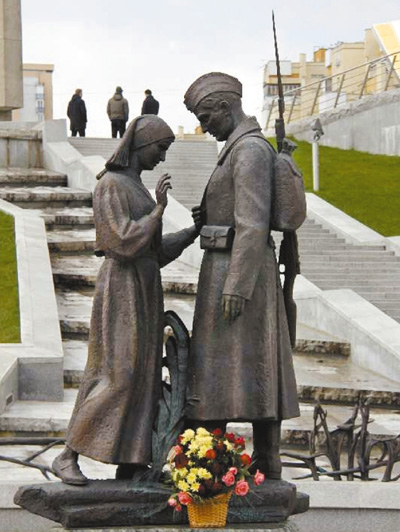 ?白俄羅斯衛(wèi)國戰(zhàn)爭歷史博物館入口處,立著一座雕像,背著槍的紅軍戰(zhàn)士正同心愛的姑娘依依惜別,雕像前常年鮮花不斷。