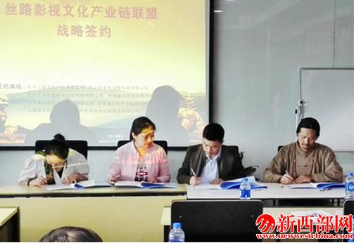 中國華服文化傳承中心主任、絲綢之路國際藝術(shù)節(jié)大型活動組委會高級顧問“絲路華服文化大使”趙晁藝(右一)受邀參加絲路影視文化產(chǎn)業(yè)鏈聯(lián)盟戰(zhàn)略簽約儀式。