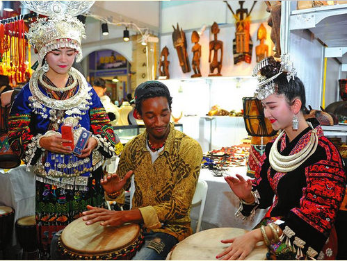 6月4日,貴州少女與非洲小伙探討樂曲節(jié)奏,絲博會成為不同膚色人士的交流平臺。 本報記者 杜瑋攝
