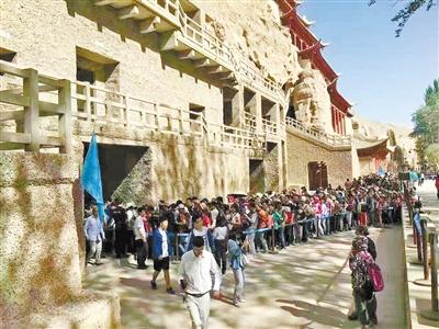 參觀敦煌莫高窟的游客排起了“長龍”