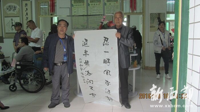 左手書法家武安成(右)向薛云平贈送作品 (新西部網(wǎng) 王順利攝)