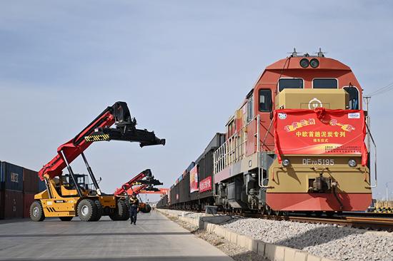 10月9日,蘭州,首趟1200噸中歐泥炭班列正在準(zhǔn)備卸貨。中新社記者 李亞龍/攝