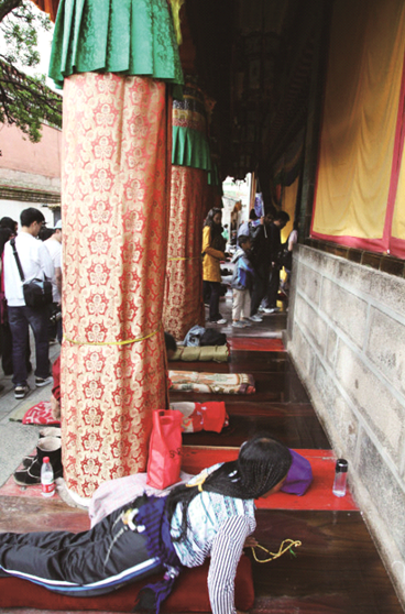 門口的信徒,成排地跪拜,如此虔誠、執(zhí)著,在晨光的照射下,額上層層汗珠。給佛祖磕一萬個“頭”,才是完完整整的一個“頭”。完完整整地磕一個頭,凝聚的是力量,一種信仰的力量,一種不堪忍受塵世苦難依然堅持的力量。當他們深深匍匐在地上的瞬間,我仿佛看到他們內(nèi)心擁有希望,心靈有所安頓,覺得他們是幸福的。