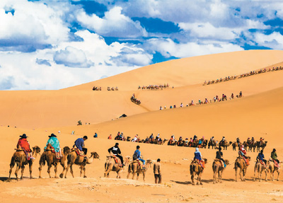 6月,絲綢之路國際旅游名城甘肅敦煌進入了旅游旺季。敦煌著名風(fēng)景名勝區(qū)鳴沙山月牙泉迎來了2017絲綢之路中國旅游年新一輪旅游熱潮。鳴沙山下游客往來不絕,大漠駝隊宛如長龍。騎駱駝體驗絲綢之路大漠風(fēng)情已成為來敦煌的海內(nèi)外游客首選的一項品牌旅游項目。圖為6月5日游客騎駱駝體驗絲綢之路大漠風(fēng)情。王斌銀攝